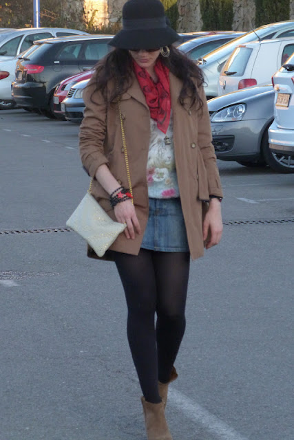Me la puse con la faldita vaquera (aprovecho el finde a usar lo que no puedo en el trabajo) y como hacia un poco de fresco pues me puse mi trench .